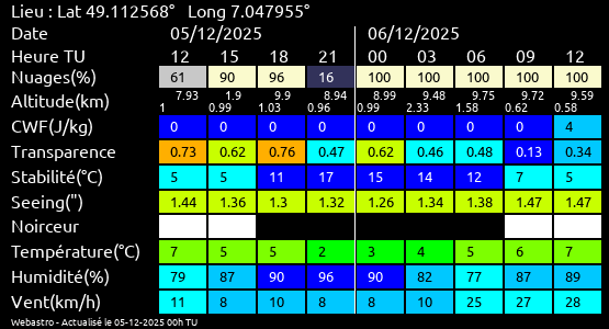 Ces paramètres sont fournis pour la nuit suivante de 12 h TU du jour en cours à 12h TU du jour suivant par pas de 3h.