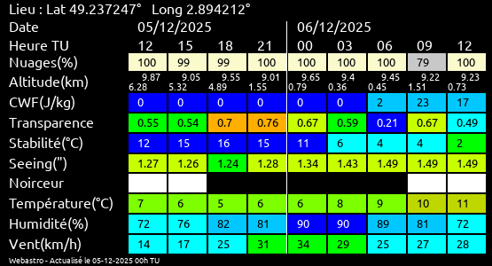 Ces paramètres sont fournis pour la nuit suivante de 12 h TU du jour en cours à 12h TU du jour suivant par pas de 3h.