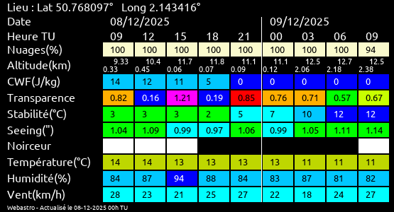Note: Le "Met'astrogramme" est un tableau recapitulant les prévisions de différents paramètres pour estimer les conditions lors d'observation du ciel.
