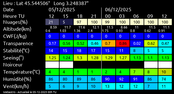 Ces paramètres sont fournis pour la nuit suivante de 12 h TU du jour en cours à 12h TU du jour suivant par pas de 3h.
