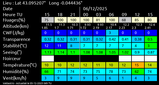 Ces paramètres sont fournis pour la nuit suivante de 12 h TU du jour en cours à 12h TU du jour suivant par pas de 3h.