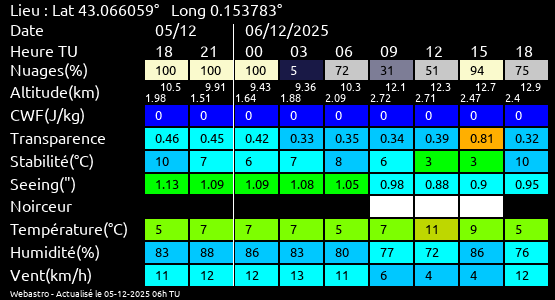 Note: Le "Met'astrogramme" est un tableau recapitulant les prévisions de différents paramètres pour estimer les conditions lors d'observation du ciel.