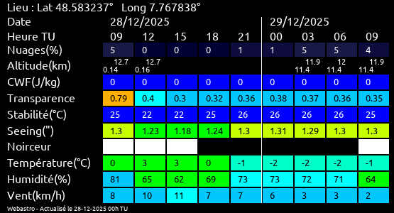 Note: Le "Met'astrogramme" est un tableau recapitulant les prévisions de différents paramètres pour estimer les conditions lors d'observation du ciel.