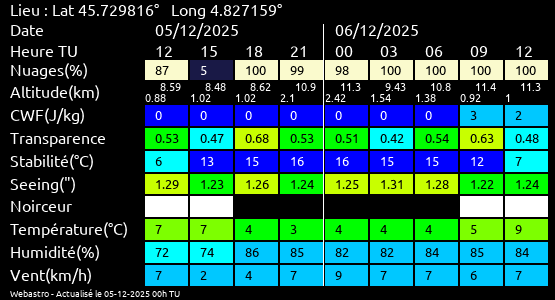 Note: Le "Met'astrogramme" est un tableau recapitulant les prévisions de différents paramètres pour estimer les conditions lors d'observation du ciel.