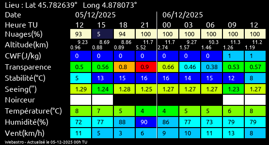 Ces paramètres sont fournis pour la nuit suivante de 12 h TU du jour en cours à 12h TU du jour suivant par pas de 3h.
