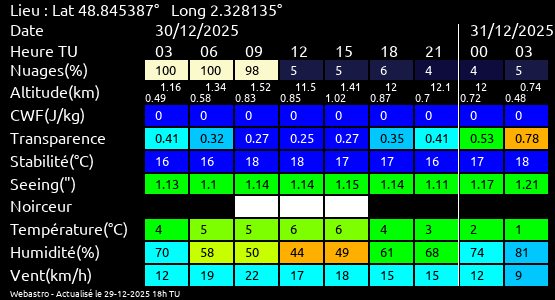 Ces paramètres sont fournis pour la nuit suivante de 12 h TU du jour en cours à 12h TU du jour suivant par pas de 3h.