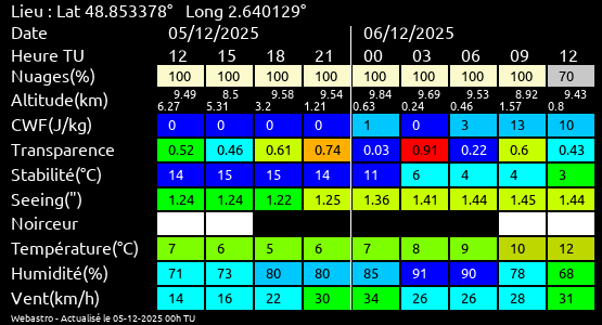 Ces paramètres sont fournis pour la nuit suivante de 12 h TU du jour en cours à 12h TU du jour suivant par pas de 3h.