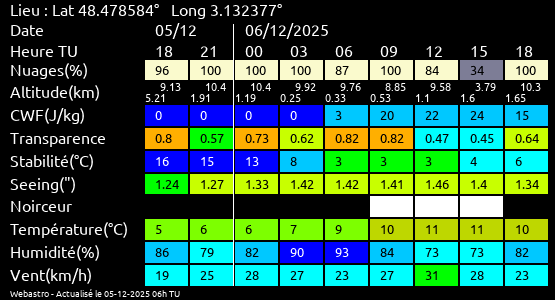Ces paramètres sont fournis pour la nuit suivante de 12 h TU du jour en cours à 12h TU du jour suivant par pas de 3h.