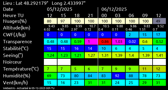 Ces paramètres sont fournis pour la nuit suivante de 12 h TU du jour en cours à 12h TU du jour suivant par pas de 3h.