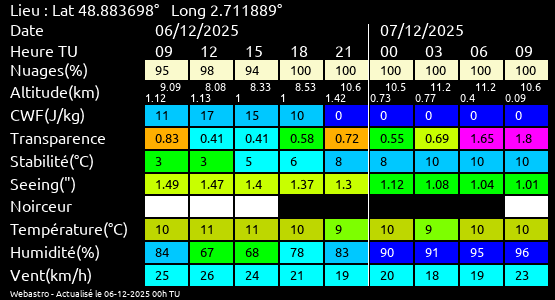 Note: Le "Met'astrogramme" est un tableau recapitulant les prévisions de différents paramètres pour estimer les conditions lors d'observation du ciel.