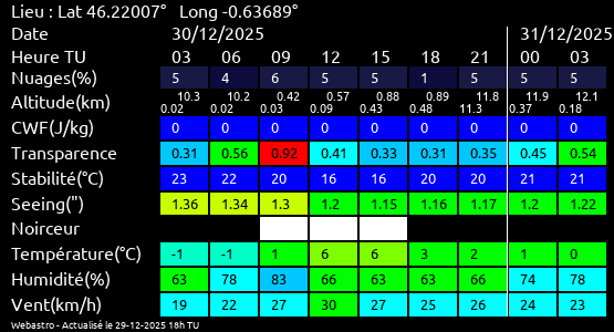 Ces paramètres sont fournis pour la nuit suivante de 12 h TU du jour en cours à 12h TU du jour suivant par pas de 3h.