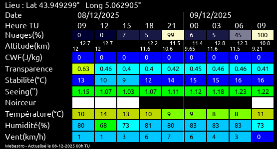 Note: Le "Met'astrogramme" est un tableau recapitulant les prévisions de différents paramètres pour estimer les conditions lors d'observation du ciel.