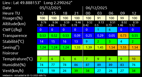 Ces paramètres sont fournis pour la nuit suivante de 12 h TU du jour en cours à 12h TU du jour suivant par pas de 3h.