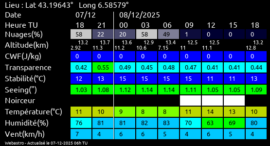 Note: Le "Met'astrogramme" est un tableau recapitulant les prévisions de différents paramètres pour estimer les conditions lors d'observation du ciel.