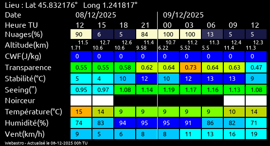 Ces paramètres sont fournis pour la nuit suivante de 12 h TU du jour en cours à 12h TU du jour suivant par pas de 3h.