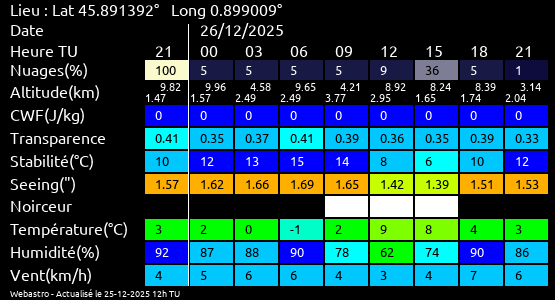 Ces paramètres sont fournis pour la nuit suivante de 12 h TU du jour en cours à 12h TU du jour suivant par pas de 3h.