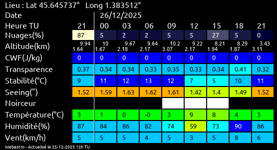 Ces paramètres sont fournis pour la nuit suivante de 12 h TU du jour en cours à 12h TU du jour suivant par pas de 3h.
