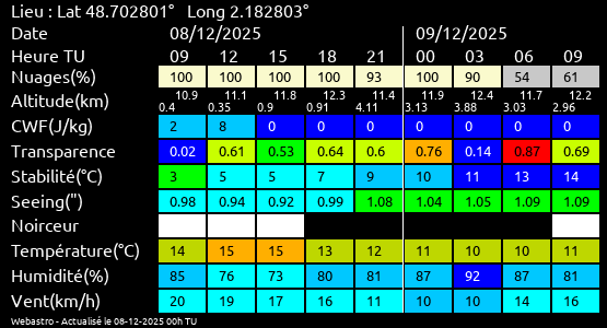 Ces paramètres sont fournis pour la nuit suivante de 12 h TU du jour en cours à 12h TU du jour suivant par pas de 3h.