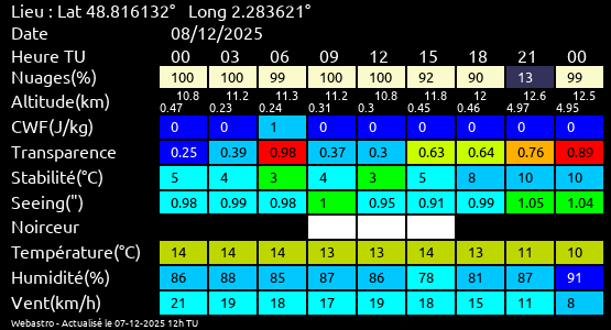 Ces paramètres sont fournis pour la nuit suivante de 12 h TU du jour en cours à 12h TU du jour suivant par pas de 3h.