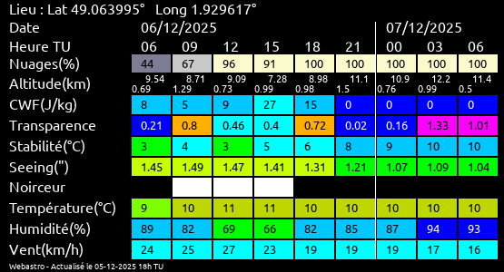 Ces paramètres sont fournis pour la nuit suivante de 12 h TU du jour en cours à 12h TU du jour suivant par pas de 3h.
