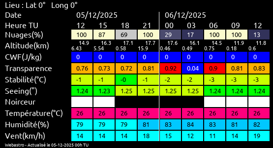 Ces paramètres sont fournis pour la nuit suivante de 12 h TU du jour en cours à 12h TU du jour suivant par pas de 3h.