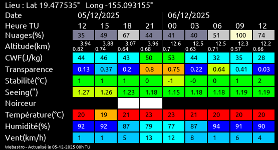 Ces paramètres sont fournis pour la nuit suivante de 12 h TU du jour en cours à 12h TU du jour suivant par pas de 3h.