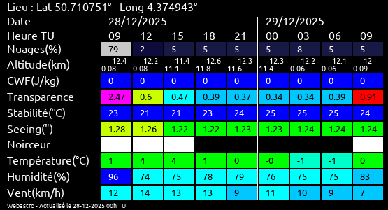 Ces paramètres sont fournis pour la nuit suivante de 12 h TU du jour en cours à 12h TU du jour suivant par pas de 3h.