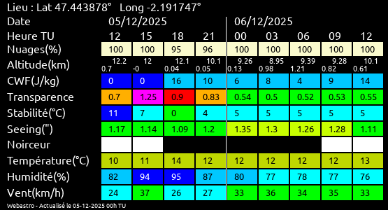 Ces paramètres sont fournis pour la nuit suivante de 12 h TU du jour en cours à 12h TU du jour suivant par pas de 3h.