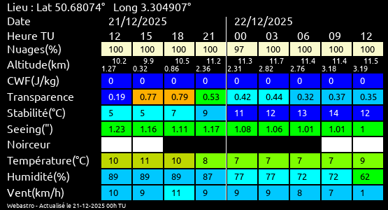 Ces paramètres sont fournis pour la nuit suivante de 12 h TU du jour en cours à 12h TU du jour suivant par pas de 3h.