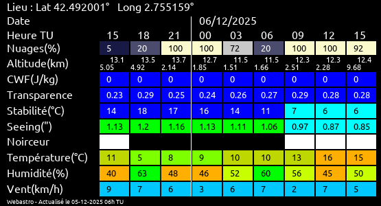 Note: Le "Met'astrogramme" est un tableau recapitulant les prévisions de différents paramètres pour estimer les conditions lors d'observation du ciel.