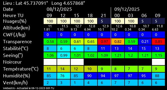 Note: Le "Met'astrogramme" est un tableau recapitulant les prévisions de différents paramètres pour estimer les conditions lors d'observation du ciel.