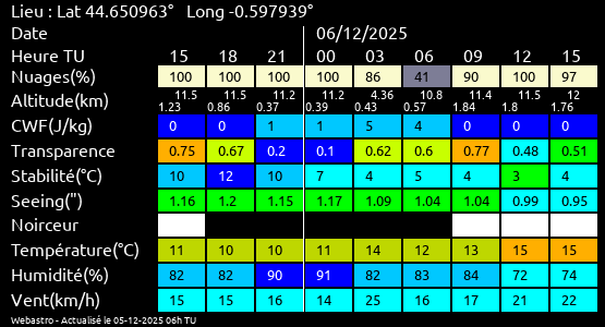 Note: Le "Met'astrogramme" est un tableau recapitulant les prévisions de différents paramètres pour estimer les conditions lors d'observation du ciel.
