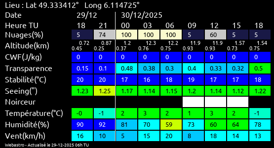 Ces paramètres sont fournis pour la nuit suivante de 12 h TU du jour en cours à 12h TU du jour suivant par pas de 3h.