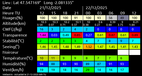 Ces paramètres sont fournis pour la nuit suivante de 12 h TU du jour en cours à 12h TU du jour suivant par pas de 3h.