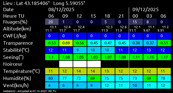 Note: Le "Met'astrogramme" est un tableau recapitulant les prévisions de différents paramètres pour estimer les conditions lors d'observation du ciel.