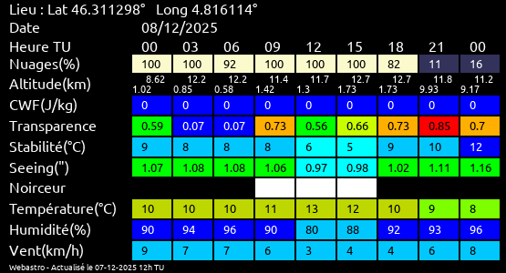 Ces paramètres sont fournis pour la nuit suivante de 12 h TU du jour en cours à 12h TU du jour suivant par pas de 3h.