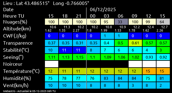Note: Le "Met'astrogramme" est un tableau recapitulant les prévisions de différents paramètres pour estimer les conditions lors d'observation du ciel.