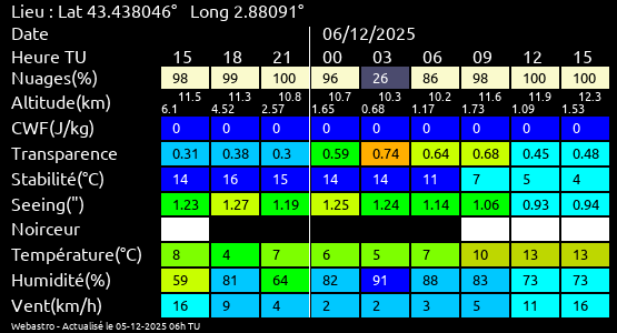 Note: Le "Met'astrogramme" est un tableau recapitulant les prévisions de différents paramètres pour estimer les conditions lors d'observation du ciel.
