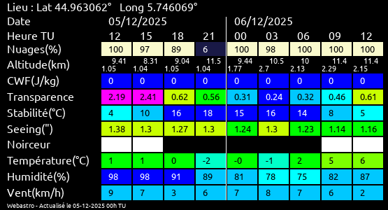 Ces paramètres sont fournis pour la nuit suivante de 12 h TU du jour en cours à 12h TU du jour suivant par pas de 3h.