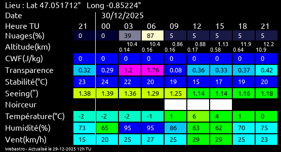 Ces paramètres sont fournis pour la nuit suivante de 12 h TU du jour en cours à 12h TU du jour suivant par pas de 3h.