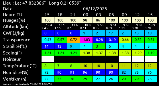Ces paramètres sont fournis pour la nuit suivante de 12 h TU du jour en cours à 12h TU du jour suivant par pas de 3h.