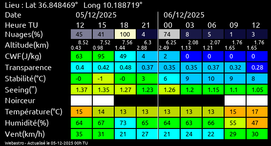 Ces paramètres sont fournis pour la nuit suivante de 12 h TU du jour en cours à 12h TU du jour suivant par pas de 3h.