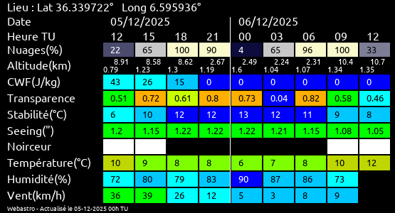 Note: Le "Met'astrogramme" est un tableau recapitulant les prévisions de différents paramètres pour estimer les conditions lors d'observation du ciel.