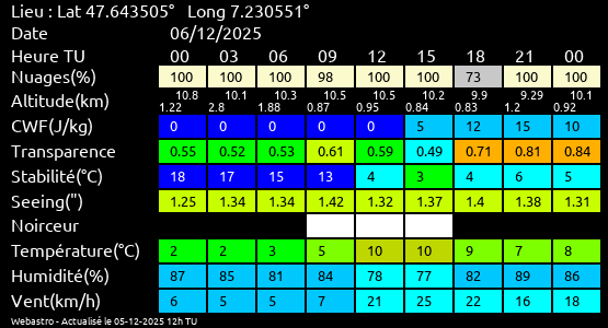 Ces paramètres sont fournis pour la nuit suivante de 12 h TU du jour en cours à 12h TU du jour suivant par pas de 3h.