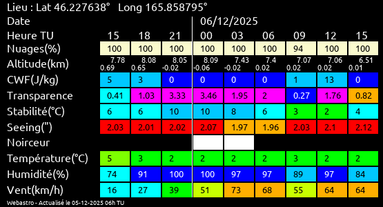 Ces paramètres sont fournis pour la nuit suivante de 12 h TU du jour en cours à 12h TU du jour suivant par pas de 3h.