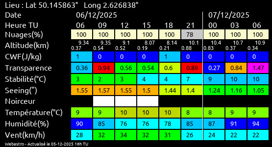 Ces paramètres sont fournis pour la nuit suivante de 12 h TU du jour en cours à 12h TU du jour suivant par pas de 3h.