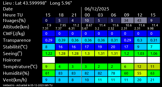 Note: Le "Met'astrogramme" est un tableau recapitulant les prévisions de différents paramètres pour estimer les conditions lors d'observation du ciel.