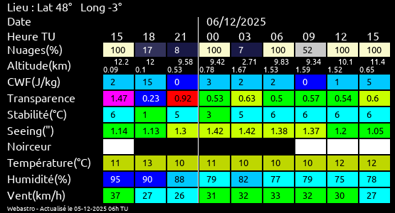Ces paramètres sont fournis pour la nuit suivante de 12 h TU du jour en cours à 12h TU du jour suivant par pas de 3h.