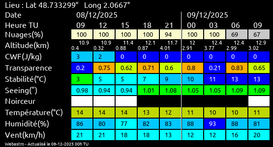Note: Le "Met'astrogramme" est un tableau recapitulant les prévisions de différents paramètres pour estimer les conditions lors d'observation du ciel.