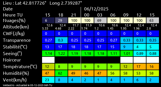 Ces paramètres sont fournis pour la nuit suivante de 12 h TU du jour en cours à 12h TU du jour suivant par pas de 3h.